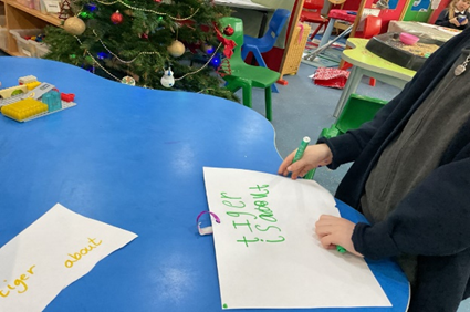 Children’s writing skills are supported as they progress through the phonics scheme: correct letter formation, spelling, sentence development and punctuation are explicitly taught by staff. Children are also encouraged to practice their writing skills during self-led play and are provided with writing resources including felt tip and gel pens, note pads, cards and envelopes, a range of pencils and other stationary. Fine motor activities are provided daily within the environment to support the children’s arm, hand and finger strength, vital for holding a pencil to write with.